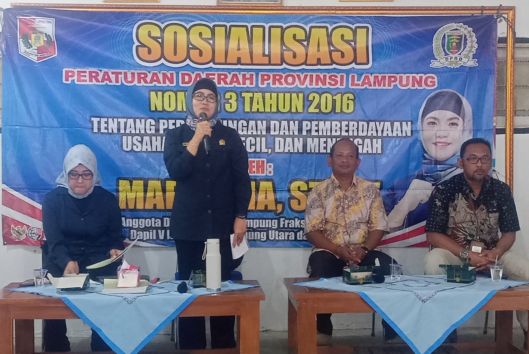 LAMPUNG UTARA (RNSI) – Guna meningkatkan produktifitas UMKM, Wakil Ketua Komisi V DPRD Provinsi Lampung, Ir. Mardiana, S.T., M.T., melangsungkan Sosialisasi Peraturan Daerah Provinsi Lampung nomor 3 tahun 2016.
