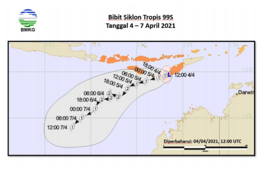 BMKG sebagai ‘Jakarta Tropical Cyclone Warning Center (TCWC)’ sejak Jum’at, 2 April 2021 telah mendeteksi adanya Bibit Siklon Tropis 99S yang mulai terbentuk di sekitar Laut Sawu, Nusa Tenggara Timur.